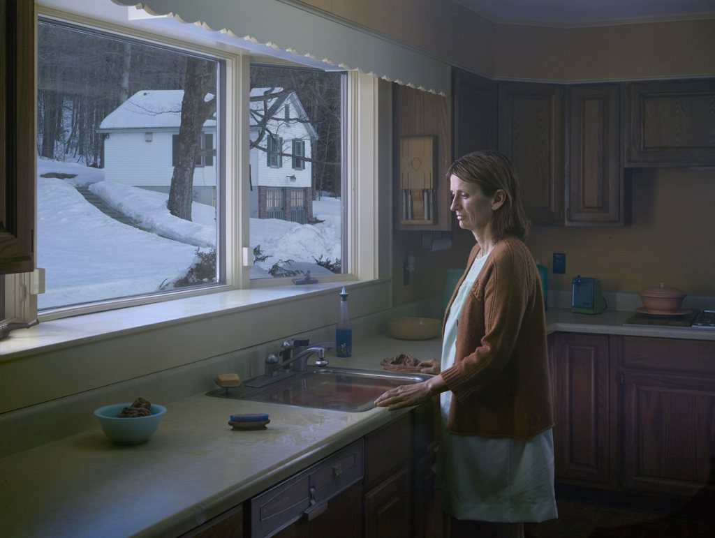 Another major theme posed by Crewdson’s work is the narrative capacity of photography. There are several names of literary greats to whom his images have been juxtaposed: Raymond Carver, John Cheever, Joyce Carol Oates, Alice Munro and others. It is curious that single shots, which capture an instant, are able to render the feeling of a ‘story’, i.e., a narrative unfolding over time. Garry Winogrand said: “Photographs are silent, they have no narrative capacity. You know what something looks like, but you don’t know what is happening. You don’t know whether the hat that is being held is about to be put on your head or has just been taken off’. This is, paradoxically, also what Crewdson thinks, who said in an interview: ‘Despite all the talk about my photographs being narratives or about storytelling, very little actually happens in images. A photograph is frozen and mute, there is no before and after. I don’t want there to be a perception of any kind of literal narrative. That is why I try not to give weight to motivation, plot or anything like that. I want to privilege the moment. In this way, the viewer is more inclined to project his own narrative onto the image’. The story, one might say, is in the eye of the beholder — in the innate need for narration. In other words, in the fact that facts must somehow have a direction, a sense. Yet there is, beyond a certain setting in provincial America, and the feeling of paralysis, another kind of relationship with literature that, especially in the 20th century, has become less ‘narrative’ than in the previous century. A writer such as Carver, for instance, as well as someone like Flannery O’Connor, does not rely on the ‘plot’ or the ‘fabula’. Often the stories are truncated without the protagonists’ story being brought to completion, almost as in a Crewdson photograph. And, perhaps, the reasoning should be reversed to think that it is literature that finds its strength when it is able to produce images. Perhaps it is useless to bother with T.S. Eliot’s ‘objective correlative’, we need only recall the episode in “Cathedral” in which Carver “photographs” the blind man who asks his guest to describe to him what a medieval church looks like and, faced with his inability to do so, the two of them grasp a pen and the sighted man guides the other’s hand in drawing on the paper. An unforgettable image, regardless of what happens before and after in the story.