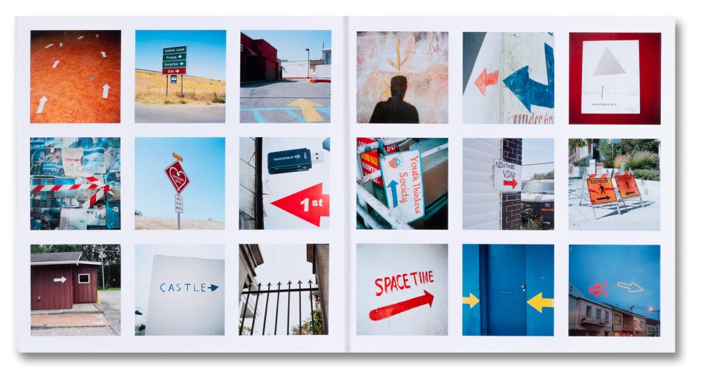 The first grid in the book gathers images that all feature one or more arrows. It’s a classic theme in American photographic tradition—just think of some of Walker Evans’s iconic Polaroids (which, perhaps, also inspired their recurrence in the work of Guido Guidi). Fulford shows arrows painted haphazardly on a floor, embedded in road signs, made with red-and-white tape stuck to a shop window, or placed atop an iron fence. Later on, we encounter a grid dedicated to the symbol “X”: iron pipes, pine branches, slashes on the canvas of an abandoned painting, the crossed legs of a Buddha statue. A few pages further, we see nine photos themed around sunset: on a beach, on the open sea, seen through frosted glass, or as red neon letters spelling “Sunset Lounge.”