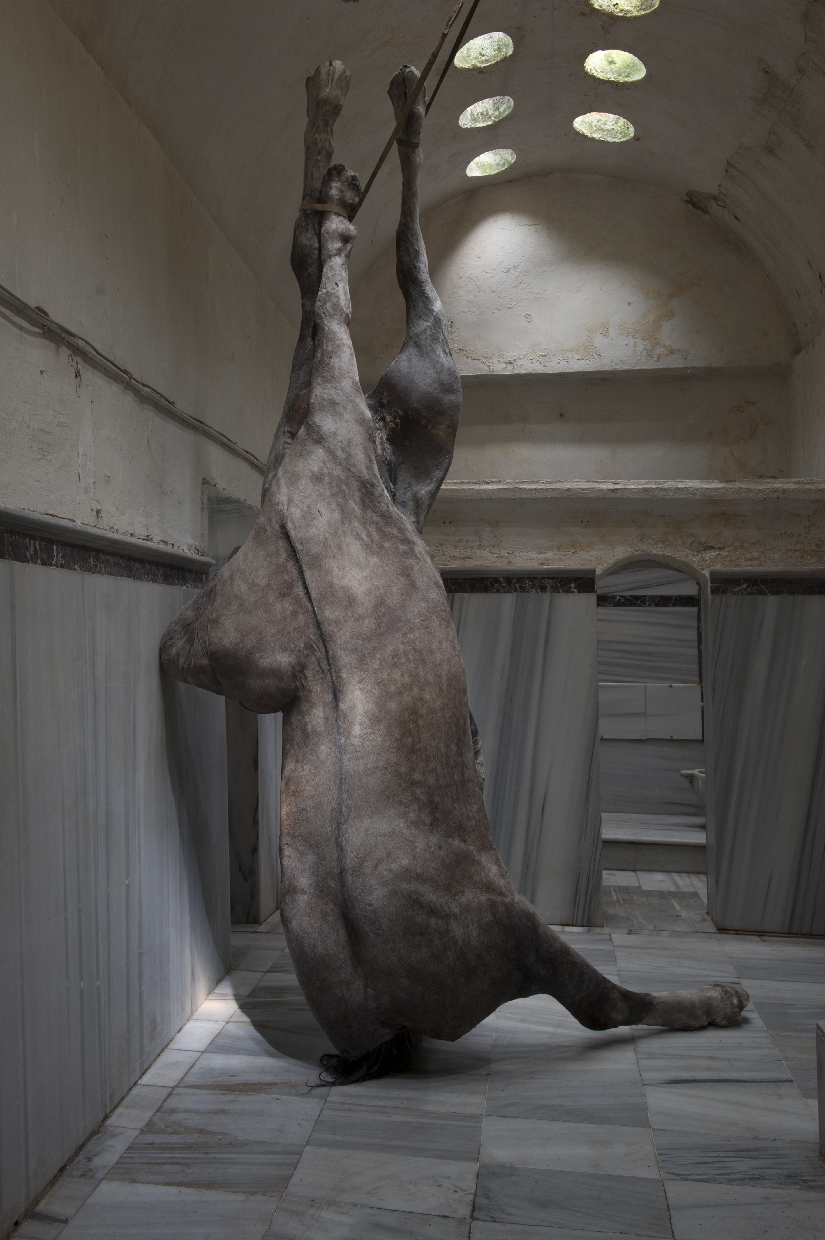 The Genoa exhibition is full of photographs of butterflies. A cow’s portrait. A lobster. A monkey. Skulls. Flip-flops. Countless flip-flops. One afternoon in his temporary Palazzo Ducale studio, Benassi receives a package containing a pair of Playstation-branded slides. He reacts as if he had received a priceless gift. I ask him what they mean to him: “They’re my obsession. I realized I was gay when I first saw them as a child, and for years I avoided wearing them—I even showered in socks—out of fear of being exposed. They were so intimate, tied to nakedness, that showing them terrified me. Now I’ve metabolized them, and I integrate them into my works as my most intimate portraits, transforming that fear into art.”