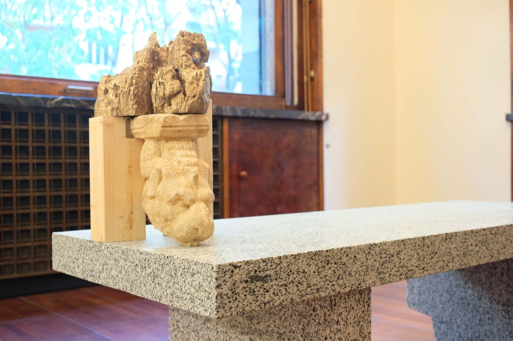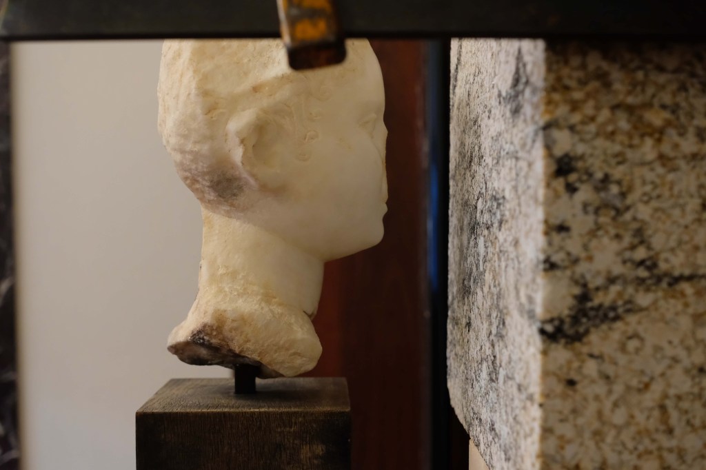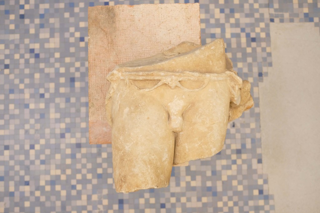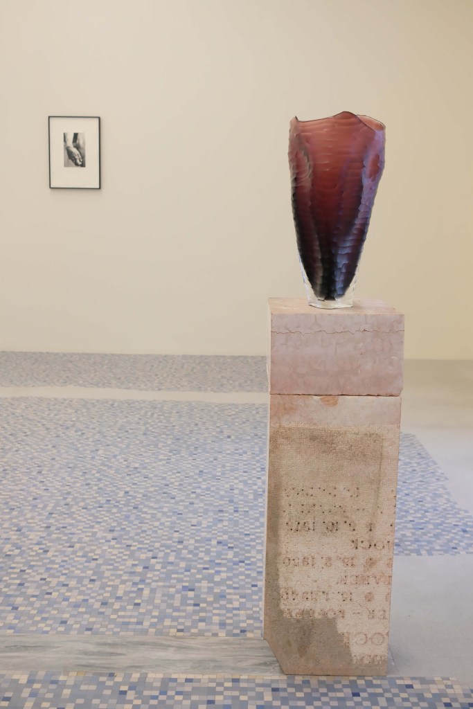 The exhibition route ends in a tunnel-like labyrinth filled with sculptures—sometimes obscenely self-mocking—objects, and writings that reflect the unsystematic, chaotic work of the Genoa residency. Emerging from the tunnel, one finds oneself in the museum bathrooms, where Benassi exhibits works made for Villa Croce, the city’s ill-fated contemporary art museum. These are photographs of his paintings depicting cut flowers, battered leaves, skies glimpsed from the villa’s garden. “I find it ironic and liberating to paint skies and then photograph them with a flash, prompting reflection on what lies behind an image. Today I feel free from any framework photography imposes, and this painting is a continuous evolution of my language.”